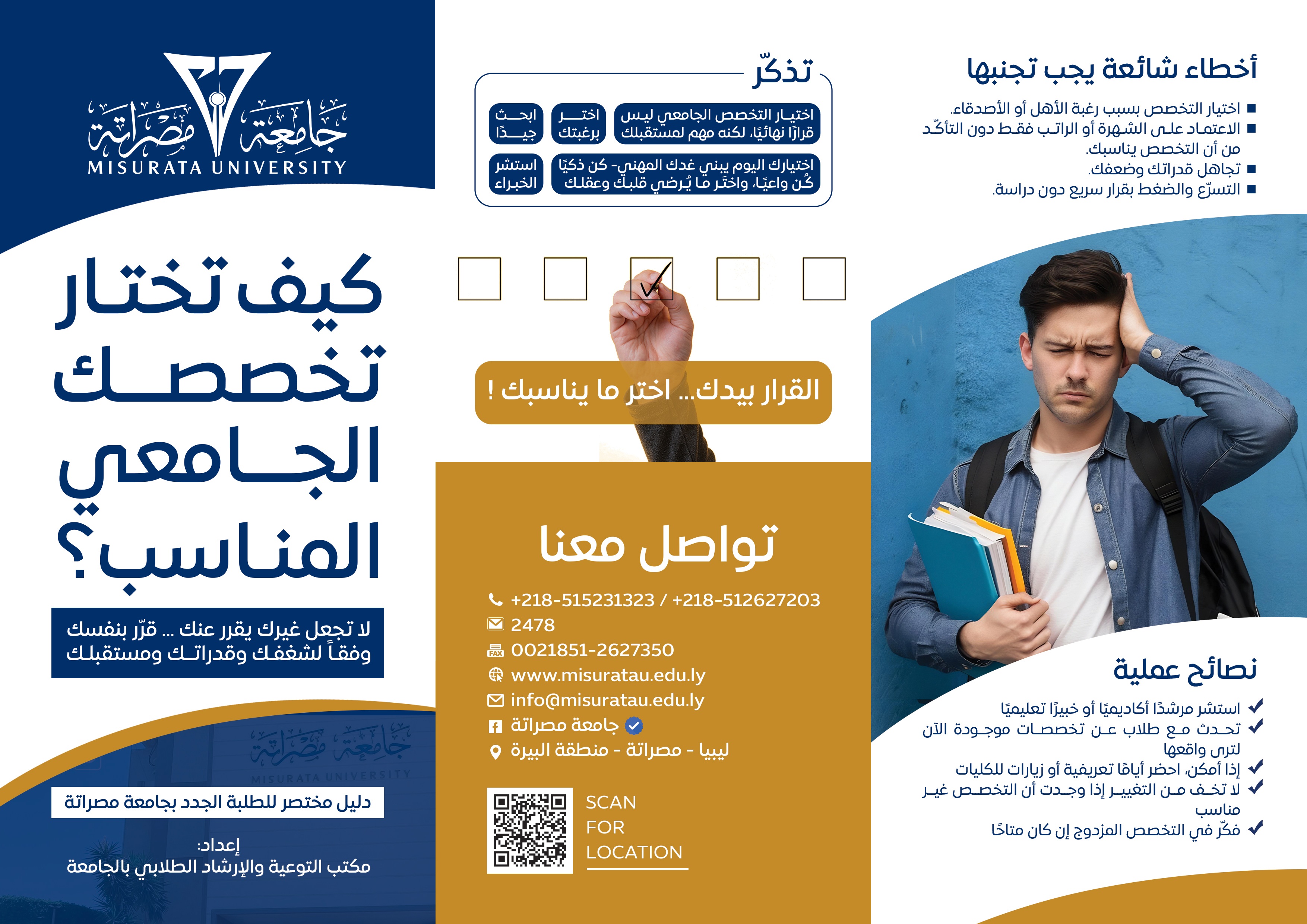 The Student Awareness and Counseling Office at Misurata University has issued a brochure titled "How to Choose the Right University Major for You?" The brochure aims to help new students choose their majors based on their abilities, interests, and the needs of the job market.