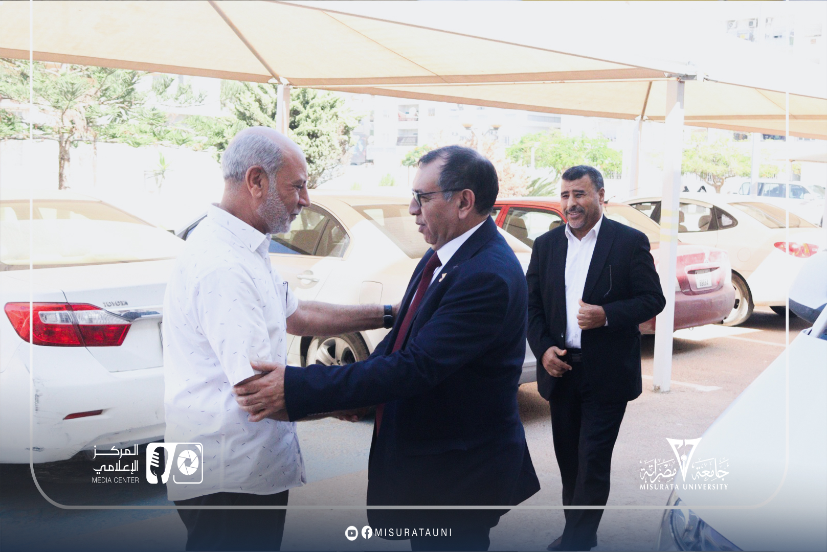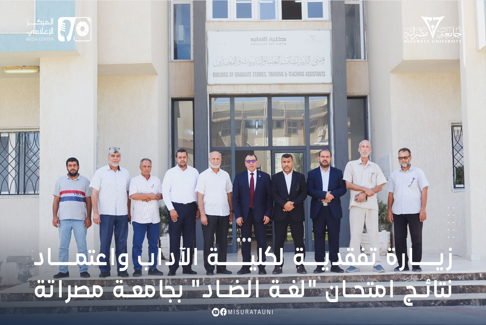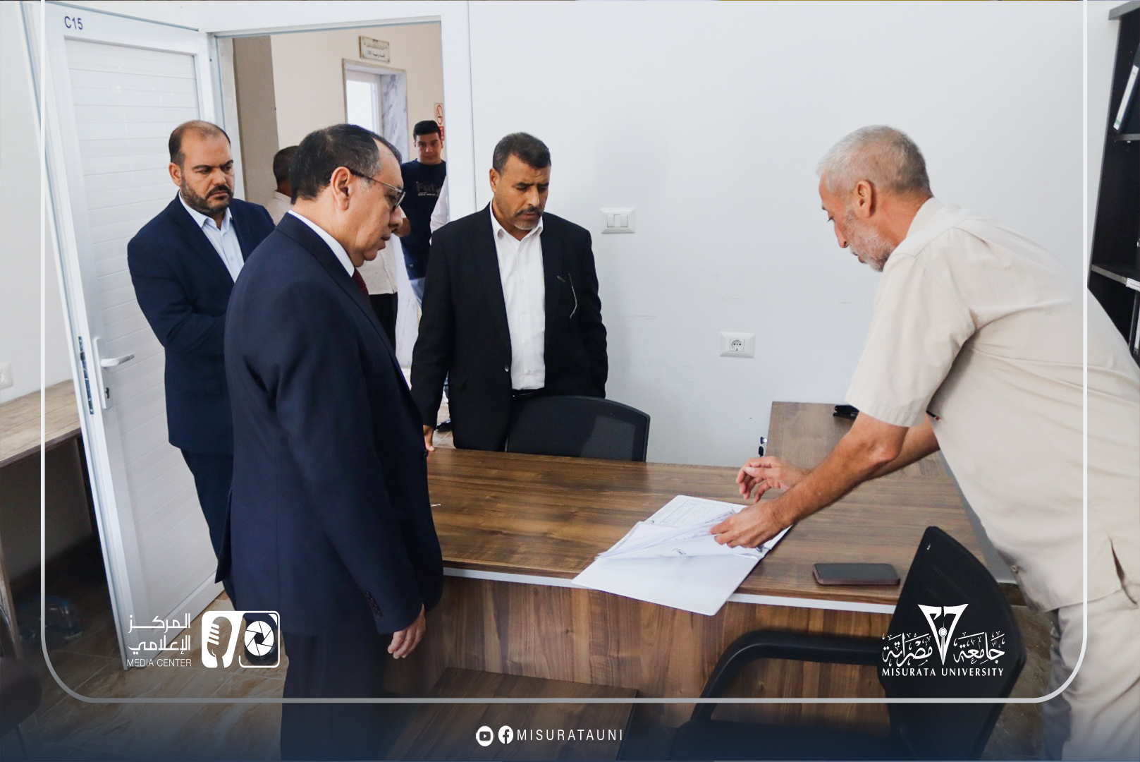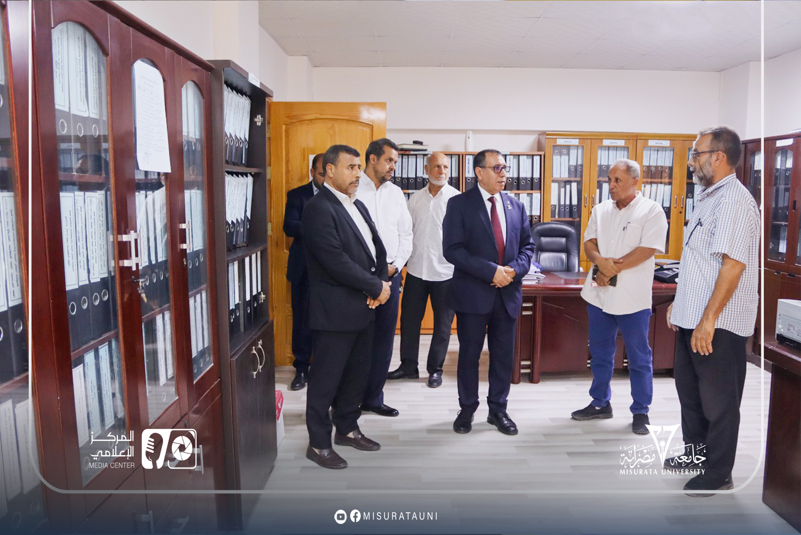 Misurata | Wednesday, September 24, 2025 - The President of Misurata University, Professor Dr. Bashir Abu Bakr Al-Qunaidi, paid an inspection visit to the Faculty of Arts, accompanied by the University`s Vice President for Academic Affairs, Professor Dr. Ibrahim Muhammad Daghman, and Secretary-General, Engineer Ali Abdullah Al-Sariti. He was received by the Dean of the College, the Vice President for Academic Affairs, heads of academic departments, and directors of departments and offices.
