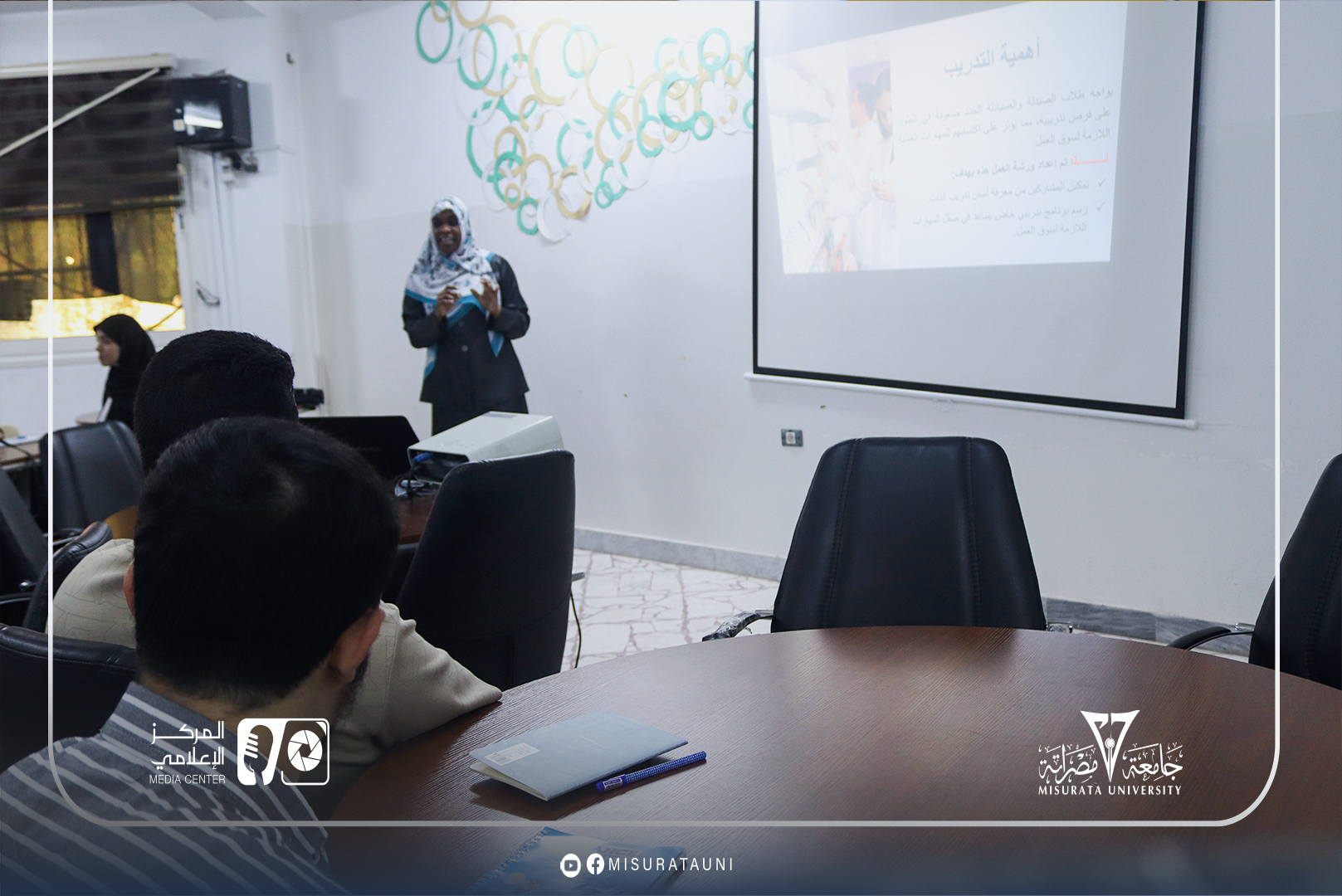 Misurata | August 21, 2025 - The Research and Consulting Department at the College of Pharmacy organized a workshop titled "Pharmaceutical Professional Training," presented by Dr. Iman Al-Mahjoub at the college library. The workshop addressed several key topics, including: the available fields for pharmacists to work in, community pharmacy as a practical model, the foundations of self-training for work in a community pharmacy, and the training programs necessary to enhance efficiency.