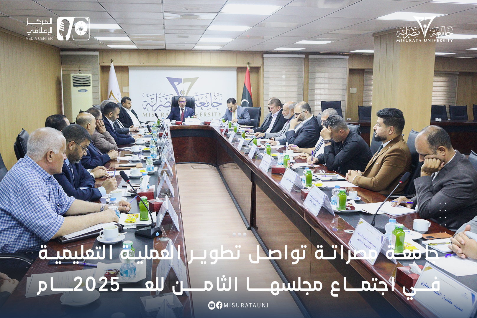 This morning, Saturday, the University of Misurata Council held its eighth regular meeting for the year 2025, chaired by the university president, Professor Bashir Abu Bakr Al-Qunaidi, and attended by the Vice President for Academic Affairs, the Secretary-General, the Registrar-General, the deans of the faculties, and the Director of the University Council Affairs Office.