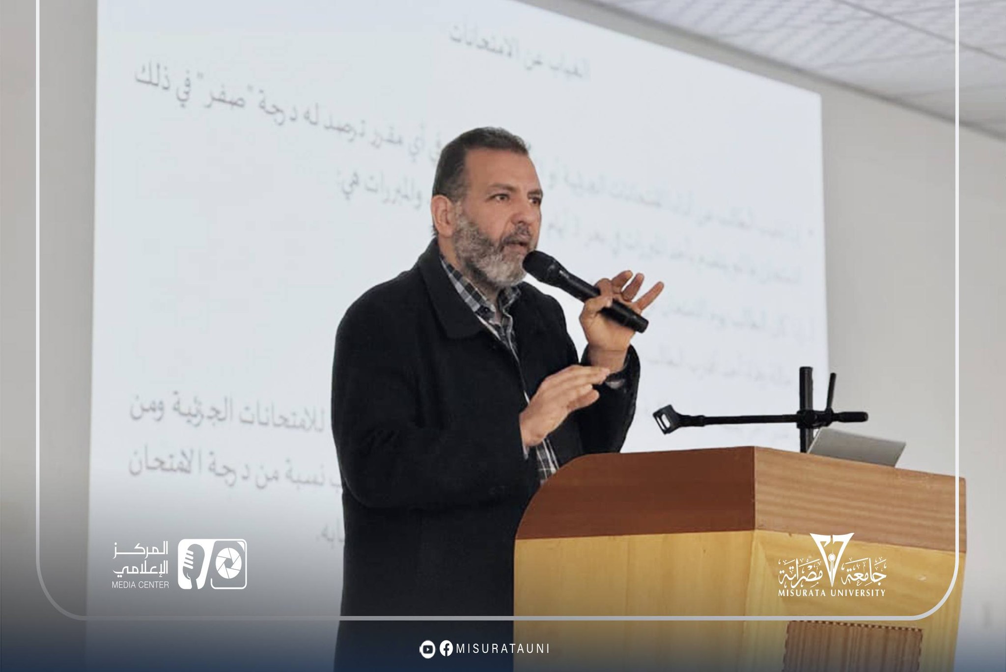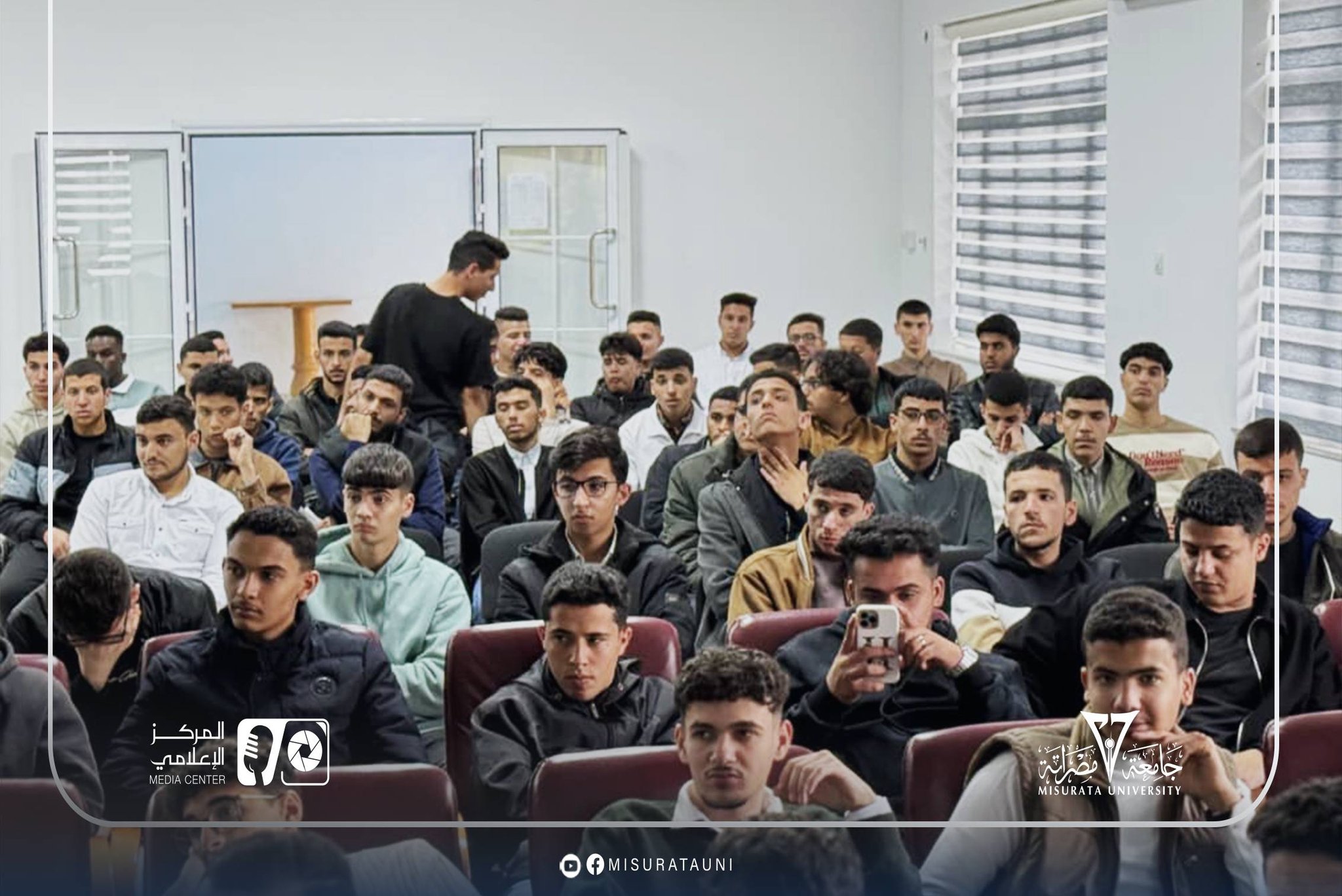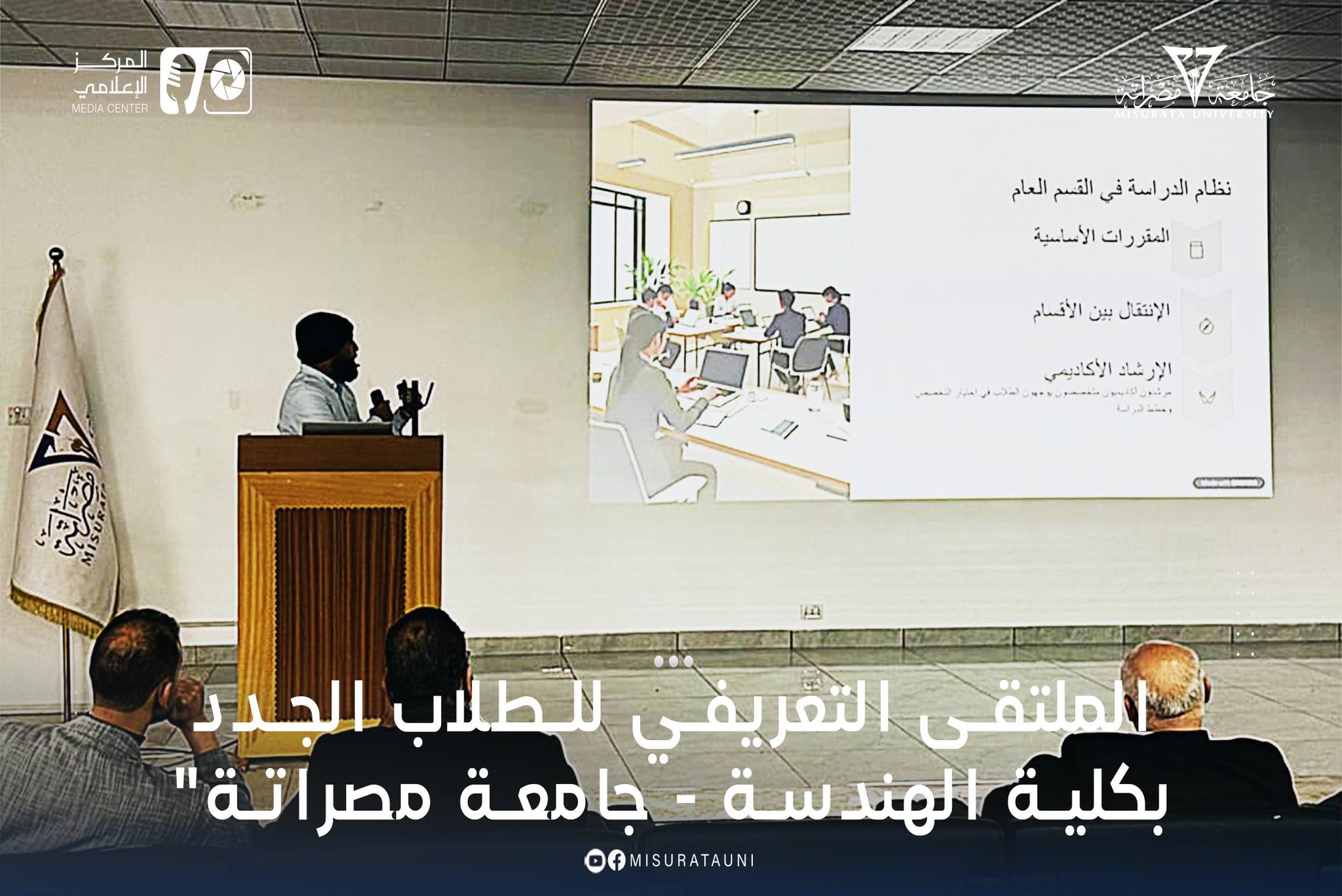 Misrata | March 29, 2026 - The orientation meeting for new students at the Faculty of Engineering - Misrata University was held today, Sunday, organized by the college administration, in the presence of the Dean of the College, the Vice Dean for Academic Affairs, the Registrar of the College, the Head of the Study and Examinations Department, a number of heads of academic departments, in addition to a group of faculty members and administrators.