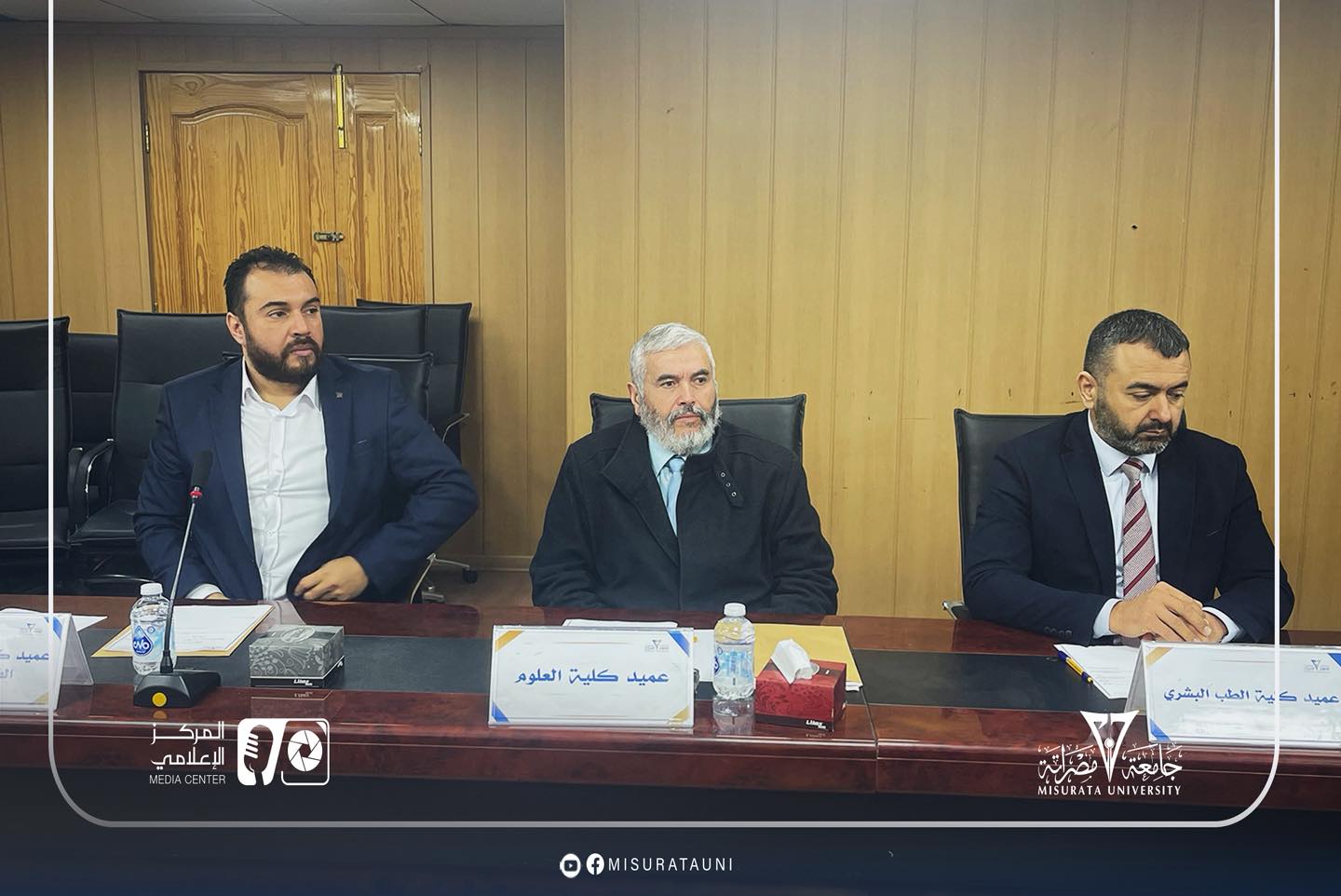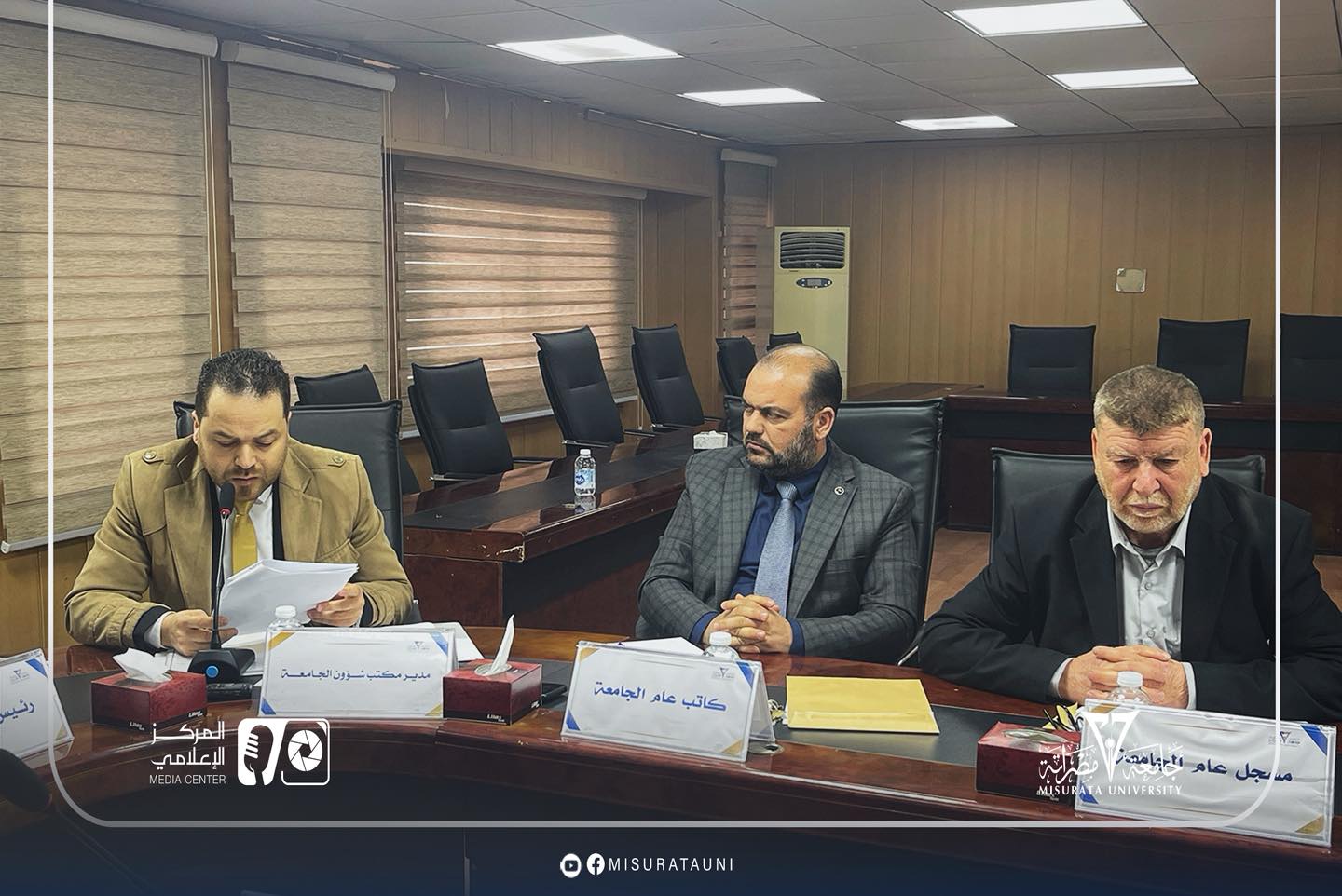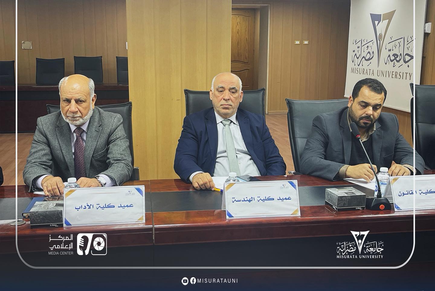 Misrata | Sunday, January 18, 2026 - The Misrata University Council held its first regular meeting for the year 2026 this Sunday afternoon, chaired by the University President, Professor Dr. Bashir Abubakr Al-Qunaidi, and attended by the Vice President for Academic Affairs, the Secretary General, the Registrar General, the Deans of the Faculties, and the Director of the University Council Affairs Office.