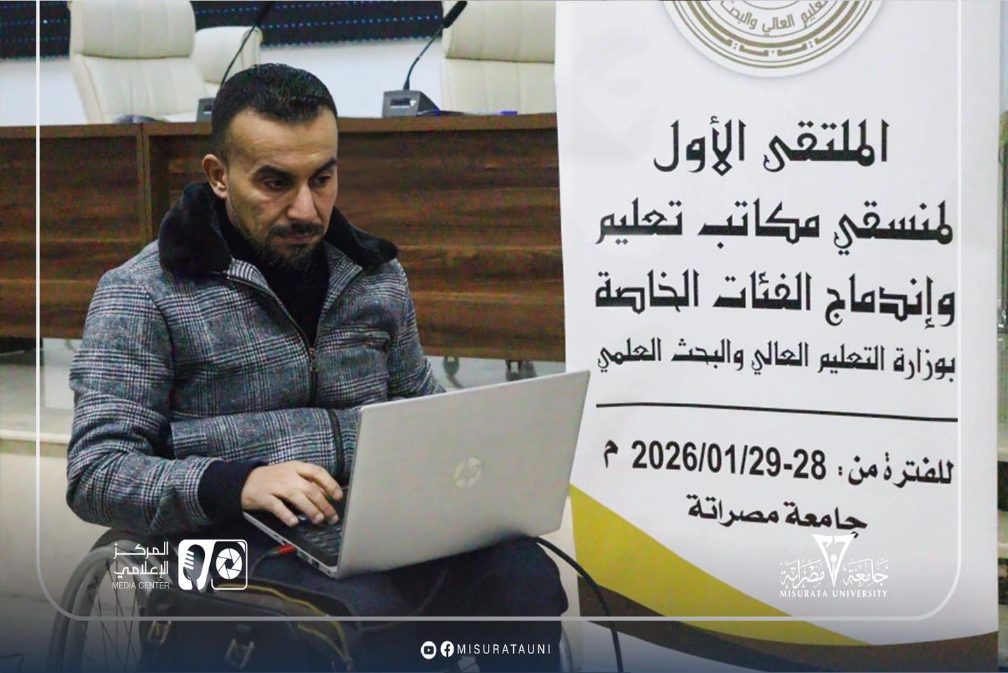 Misurata | Wednesday, January 28, 2026 – Misurata University hosted the activities of the First Forum for Coordinators of Special Needs Education and Integration Offices across Libyan universities and academies. The event is held under the supervision of the Office of Special Needs Education and Integration at the Ministry of Higher Education and Scientific Research of the Government of National Unity, running from January 28 to 29, 2026.